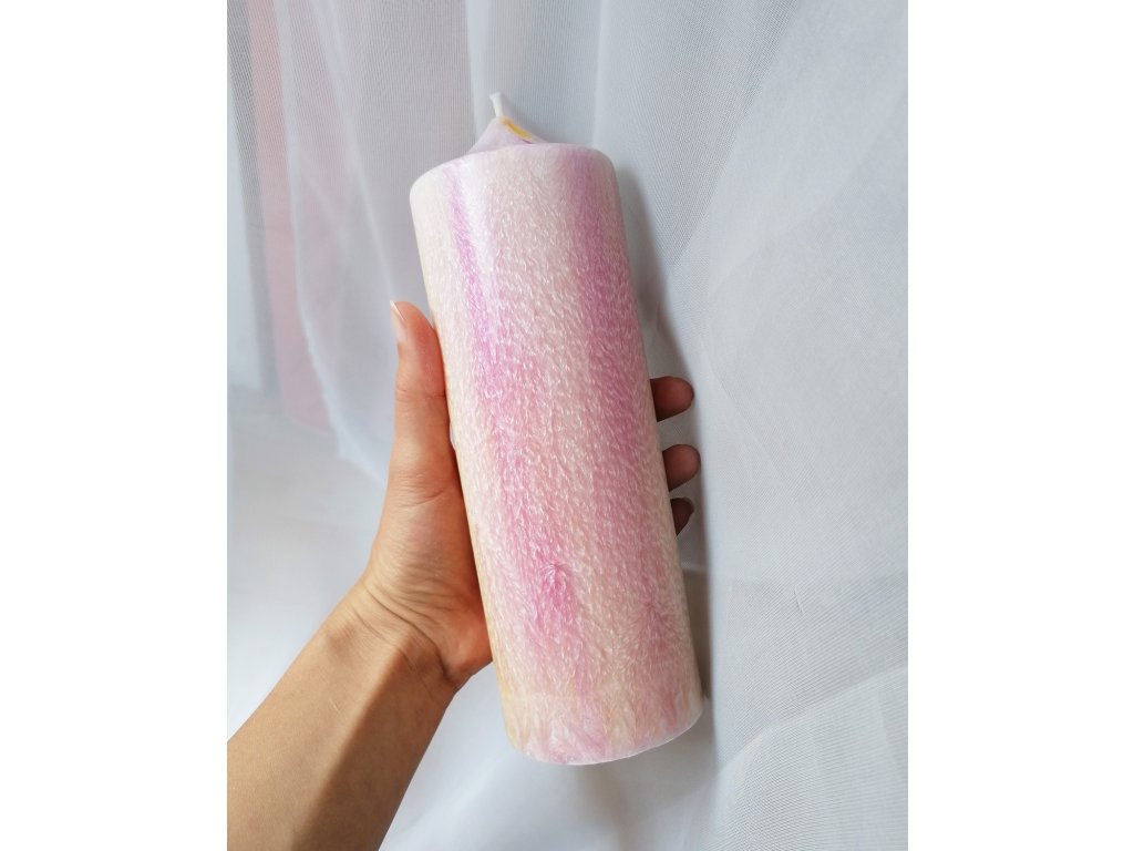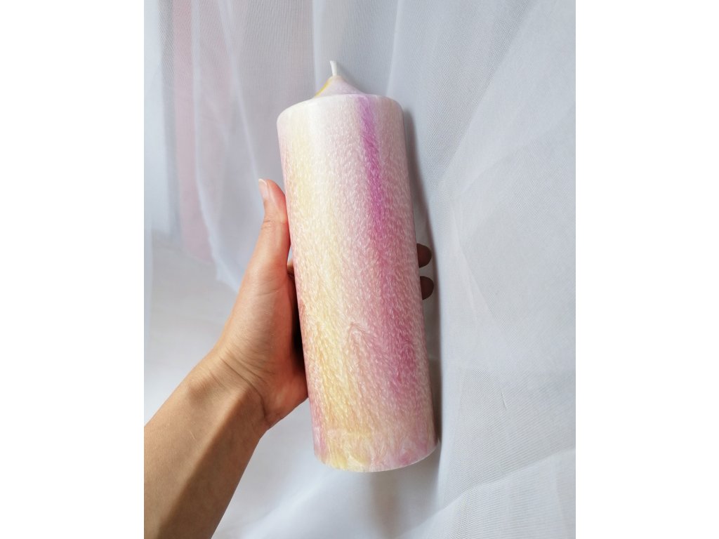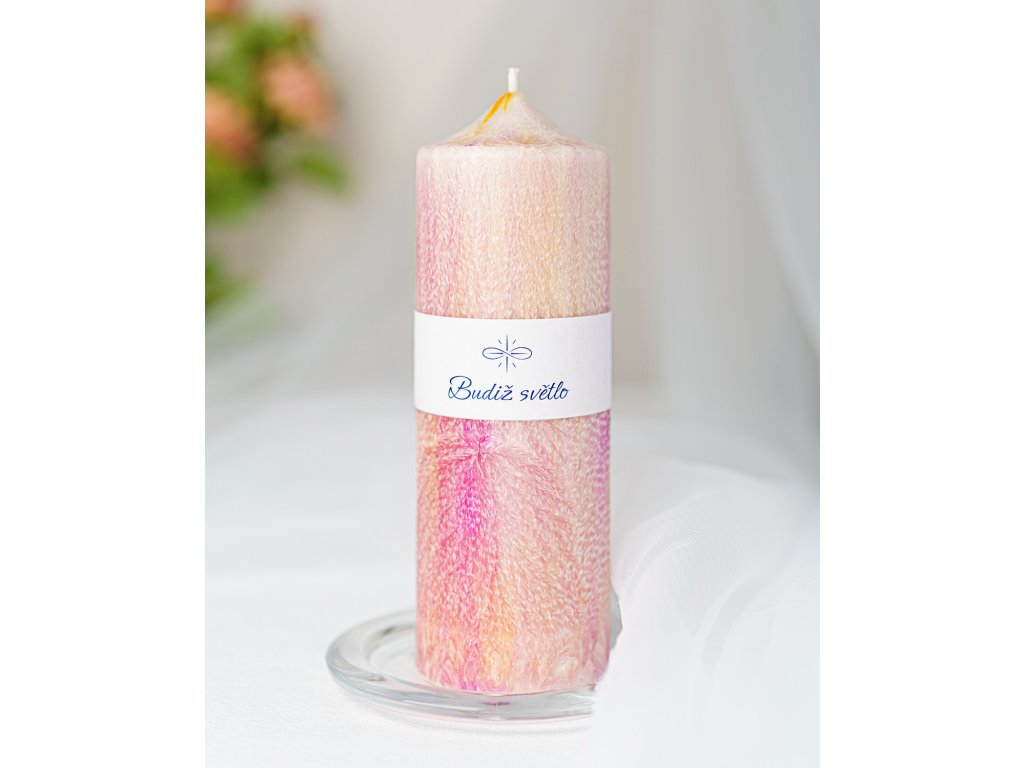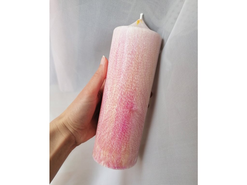 Svíčka vzniká kombinací růžové a žluté barvy s krásně jemnými přechody. Každá svíčka je unikátní - texturou, která se vykreslí na jejím povrchu i tím, jak se barvy smíchají. Tento proces nemám pod kontrolou a sama jsem vždy v úžasu, jaká svíčka vznikne.